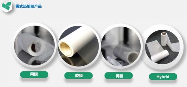 热熔胶膜最常分为三种形式, 热熔胶膜, 热熔胶网膜,热熔胶网格还有Protechnic 开发的新品Hybrid 高密度热熔网膜。